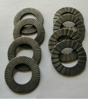 雙碟防松墊片由兩片墊片組成,采用結構制鎖方式,墊片的小齒面加工成放射狀直齒或圓弧齒,大齒面加工成大齒斜面。當螺栓預緊時,墊片小齒面一側楔入螺栓頭接觸面,另一側小齒面楔入聯接件表面,兩墊片之間大齒面相楔嚙合,實現自鎖功能。