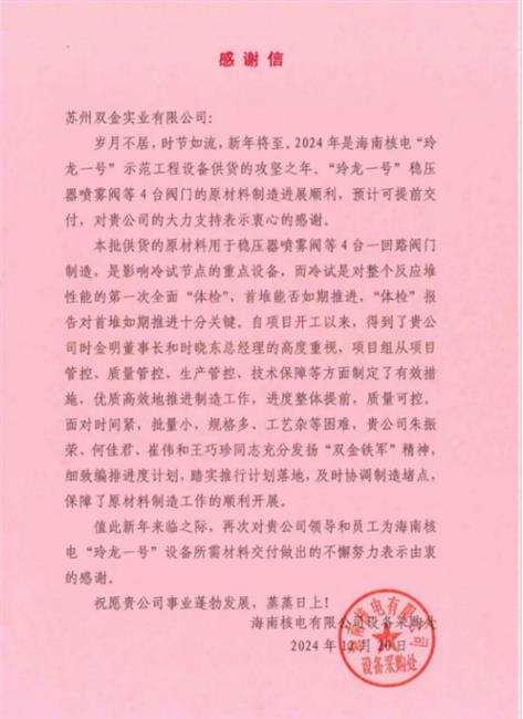 蘇州雙金收到海南核電有限公司高度贊揚交付“玲龍一號”穩壓器噴霧閥等4臺閥門原材料完美供貨的感謝信
