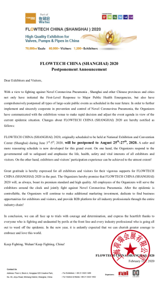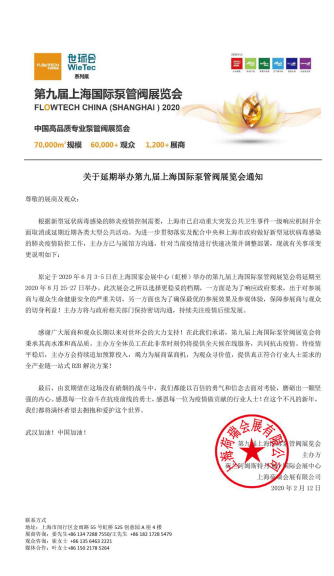 鑒于目前我國新型冠狀病毒感染肺炎疫情防治面臨嚴峻形勢,上海市已啟動重大突發公共衛生事件一級響應機制,并全面取消或延期近期各類大型公共活動。 為避免人員聚集引發交叉感染,最大限度降低人群集聚可能造成的疫情傳播風險,保障所有展商、觀眾及參會人員的安全和健康,主辦方決定,將原定于2020年6月3-5日在上海國家會展中心(虹橋)舉辦的第九屆上海國際泵管閥展覽會將延期至2020年8月25-27日舉辦。