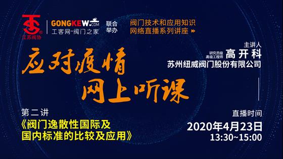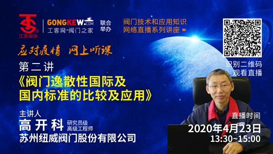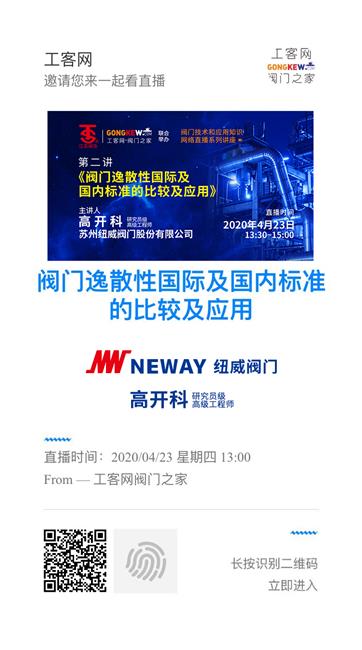 江蘇省閥門工業(yè)協(xié)會(huì)與“工客網(wǎng)-閥門之家”聯(lián)合定于2020年4月23日下午:13:30--15:00舉行《閥門技術(shù)和應(yīng)用知識(shí)網(wǎng)絡(luò)直播系列講座》第二講,將走進(jìn)蘇州紐威閥門股份有限公司現(xiàn)場(chǎng)直播,邀請(qǐng)?zhí)K州紐威閥門股份有限公司總工程師高開科主講《閥門逸散性國際及國內(nèi)標(biāo)準(zhǔn)的比較及應(yīng)用》的閥門低泄漏專業(yè)標(biāo)準(zhǔn)和應(yīng)用知識(shí)。