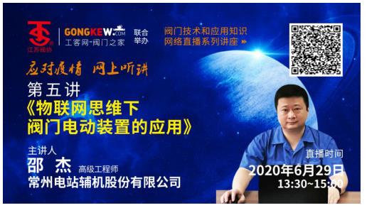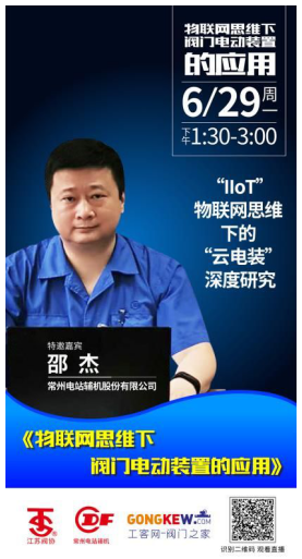 江蘇省閥門工業協會與“工客網-閥門之家”聯合定于6月29日下午13:30--15:00走進常州電站輔機股份有限公司,進行第五講現場直播,邀請該公司技術部經理、高級工程師邵杰主講《物聯網思維下閥門電動裝置的應用》主要介紹物聯網下閥門電裝應用相關內容,敬請閥門行業內外人士進入下面二維碼準時組織收聽收看!