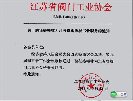 經協會第八屆會員大會改選換屆大會選舉,經九屆理事會工作會議審議通過,聘任盛根林為江蘇省閥門工業協會秘書長職務。