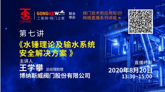江蘇省閥門工業協會與“工客網-閥門之家”聯合定于8月20日走進省外地區天津市--博納斯威閥門股份有限公司,在當天下午13:30--15:00進行第七講網上現場直播,由該公司總經理助理王學攀主講《水錘理論及輸水系統安全解決方案》,主要探討《從水錘的基本概念到水錘的分類,再到如何通過閥門來防止水錘帶來的破壞,系統的解決了輸水管道安全運行的問題》相關內容,歡迎閥門行業內外人士組織收聽收看!共同探討閥門技術水平提高。