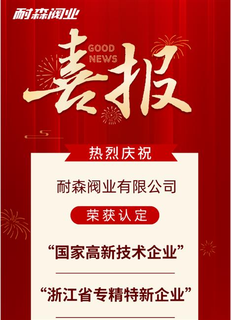 耐森閥業榮獲“國家高新技術企業”、“浙江省專精特新企業”認定
