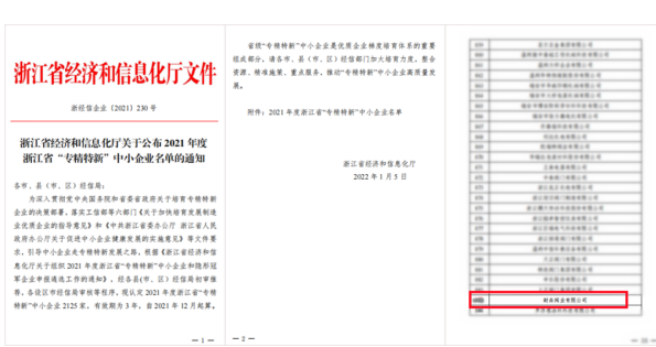 2022年1月5日,浙江省經濟和信息化廳發布了《浙江省經濟和信息化廳關于公布2021年度浙江省“專精特新”中小企業名單的通知》。耐森閥業有限公司被認定為2021年度“浙江省專精特新中小企業”。