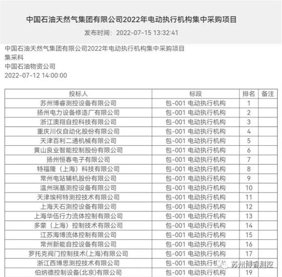 其中,蘇州博睿測控設備有限公司以綜合分排名第一名中標中石油2022年《包-001電動執行機構集中采購項目》。