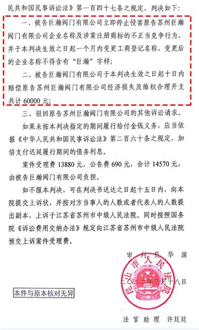 【閥門商標維權】蘇州巨瀚閥門有限公司訴告“巨瀚閥門”不正當競爭及商標維權案經昆明法院判決勝訴