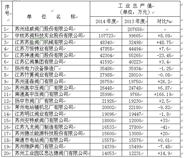 江蘇閥門行業(yè)2014年度產(chǎn)銷利排列前20名的企業(yè)