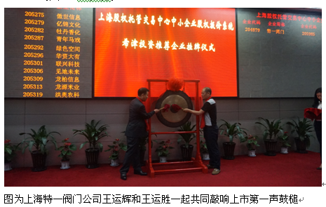 6月2日下午,隨著上海特一閥門制造有限公司創始人王運輝和董事長王運勝一起共同敲響上市第一聲鼓槌后,上海閥門行業重點企業之一--上海特一閥門制造有限公司成功掛牌張江松濤路560號---上海股權托管交易中心中小企業股權報價系統Q版,(上市名稱:“特一閥門”,股權代碼:204879),這使得上海“特一閥門”縱身一躍登上資本市場交易平臺,為下一步的發展壯大提供了廣闊的空間。公司依托上海股權交易中心這一對接資本市場的投融資平臺,迎來了企業發展進程中的又一個里程碑。