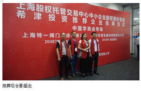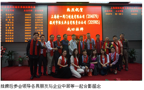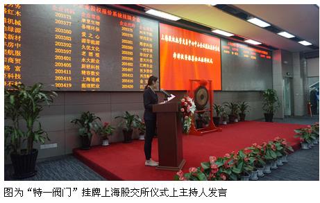 此次特一閥門的掛牌是有希津投資推薦企業的掛牌的,來自上海閥門業、中國學商會、江蘇、浙江溫州的企業界領導和朋友一起共亨“持一閥門”掛牌儀式。下午3點45分左右,上海“特一閥門”掛牌儀式啟動,上海股權交易中心業務主任發言,接著中國學商會名譽會長李復耕和上海普陀區工商聯副主席方偉林、中國學商會會長、龍灣上海商會執行會長黃梁,以及上海泵閥行業協會等有關部門負責人發言,他們均表示對上海特一閥門掛牌上海股交所表示熱烈祝賀,希望“特一閥門”在今后發展征程中再接再厲,在閥門產品上做精做強,深化企業管理,促進企業規范化,提升產品品質,做強閥門的實體產業,借助資本運作的機遇,走自己發展之路,壯大閥門產業。