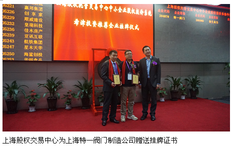 接著上海股權交易中心為上海特一閥門制造公司贈送上市紀念牌,作為企業發展進程中重要見證。接著,上海特一閥門制造有限公司創始人王運輝和董事長王運勝一起共同敲響上市第一聲鼓槌后,標志著特一閥門正式掛牌上海股權托管交易中心中小企業股權報價系統Q版,走上資本市場的新的征程。
